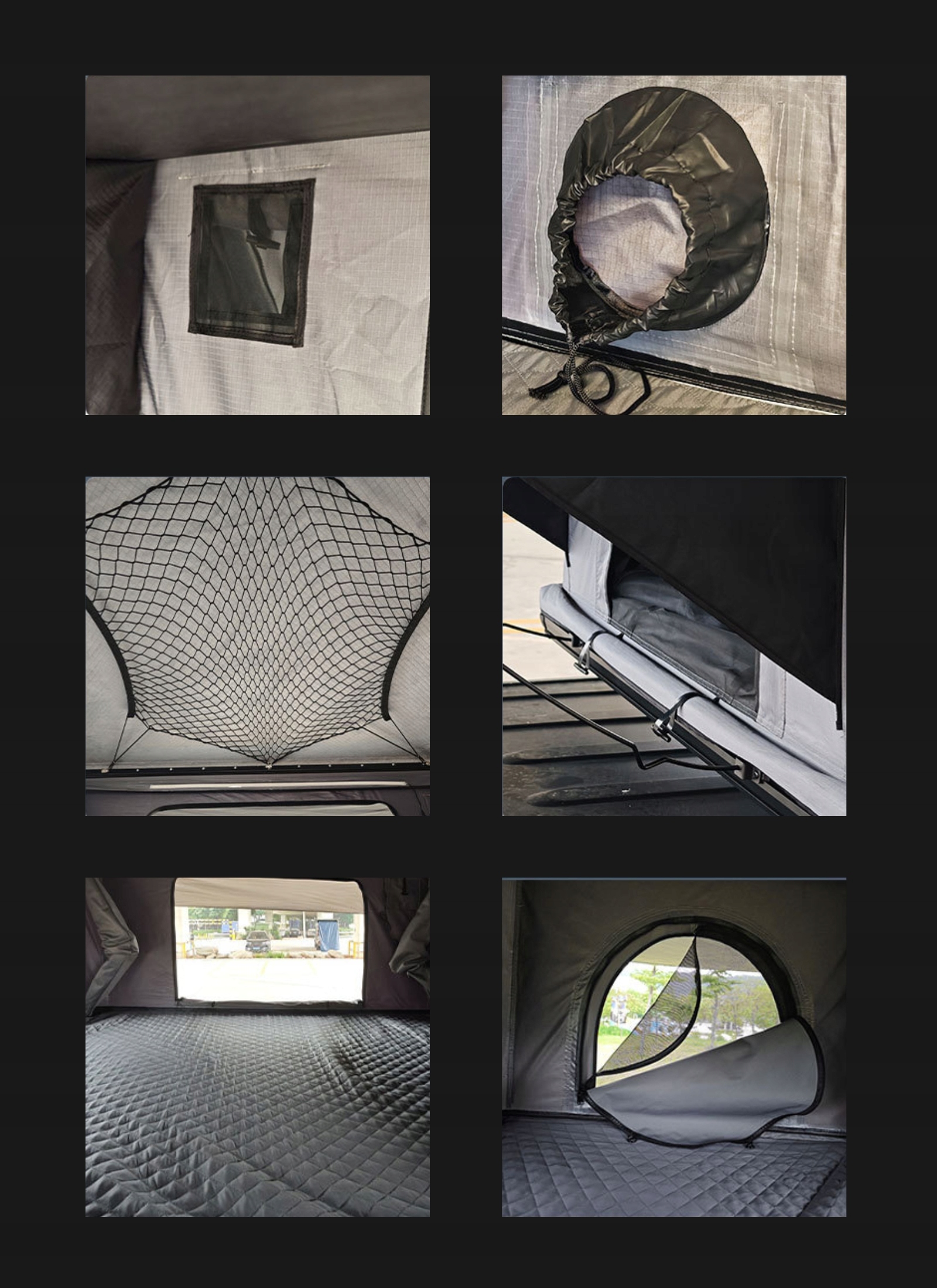 Hydrauliczny mechanizm otwierania. Wysoka wodoodporność 3000 mm. Materac z pranym pokrowcem. Moskitiera. Wbudowane oświetlenie LED. Kompaktowy po złożeniu. Pasuje do większości aut z relingami.