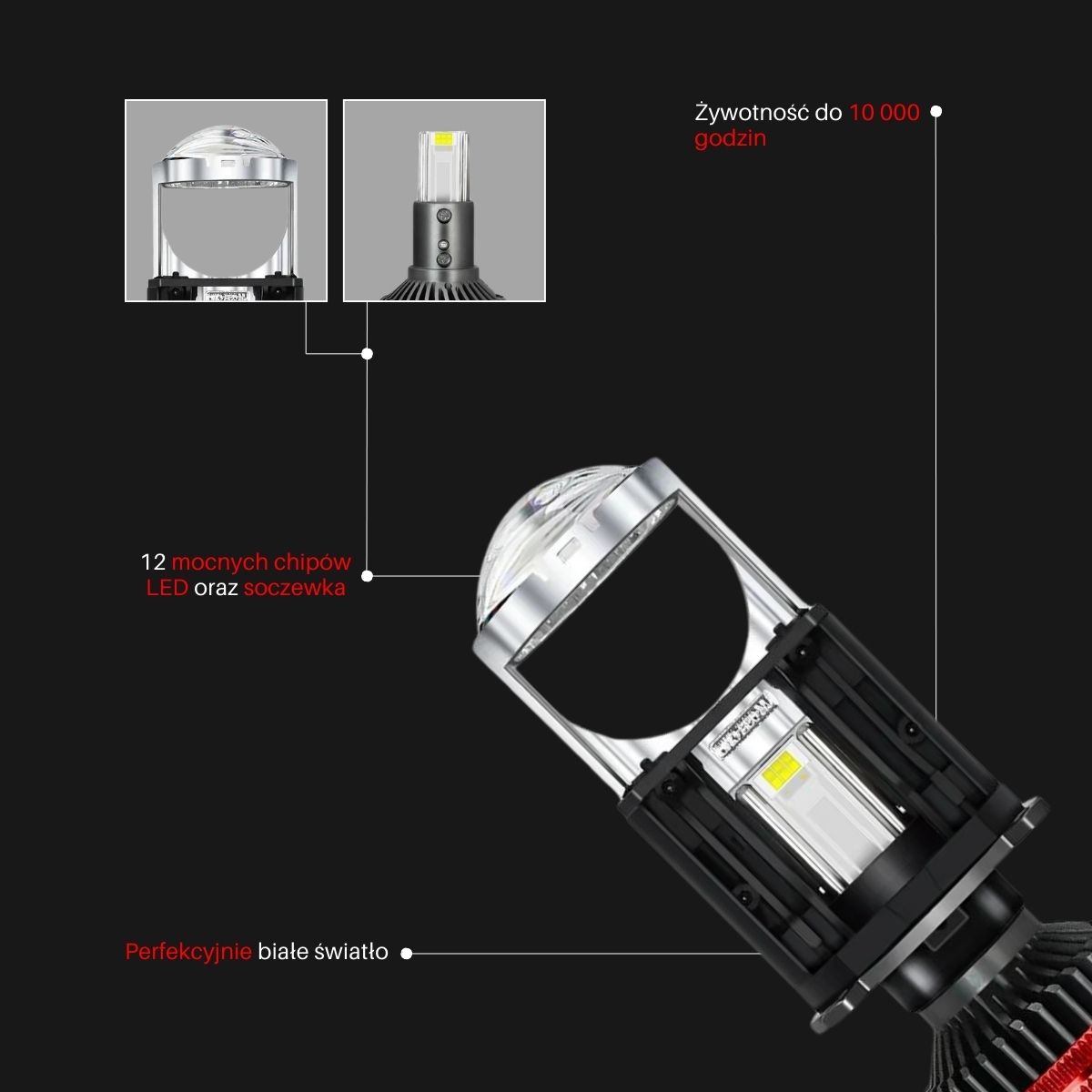 - Technologia BiLED: Możliwość przełączania między światłami mijania a drogowymi w jednym produkcie.