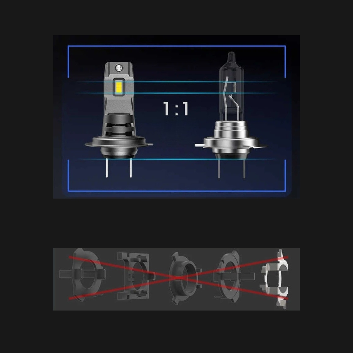 - Źródło światła na tej samej wysokości co w halogenie – idealne odwzorowanie fabrycznego strumienia światła.